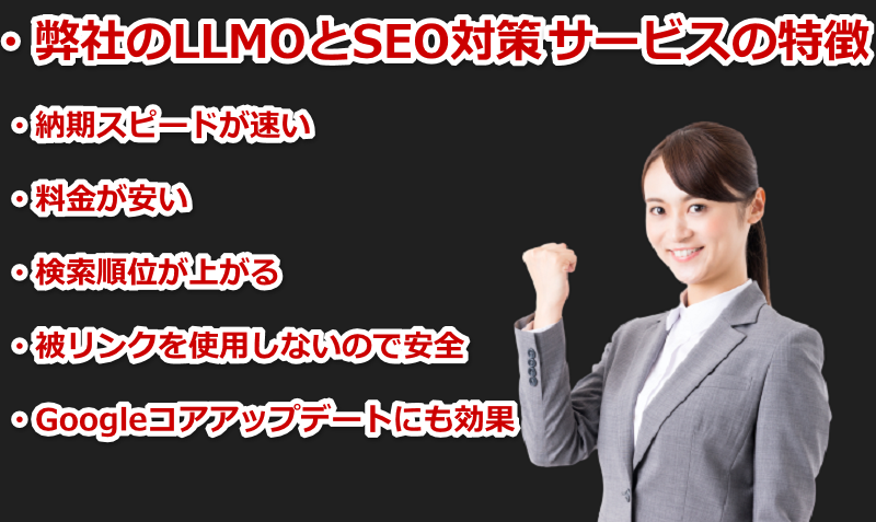 弊社のLLMOとSEO対策サービスは、ご注文いただいてからの納期が大体1週間程度となっていて、すごくスピーディで助かったと喜ばれています。